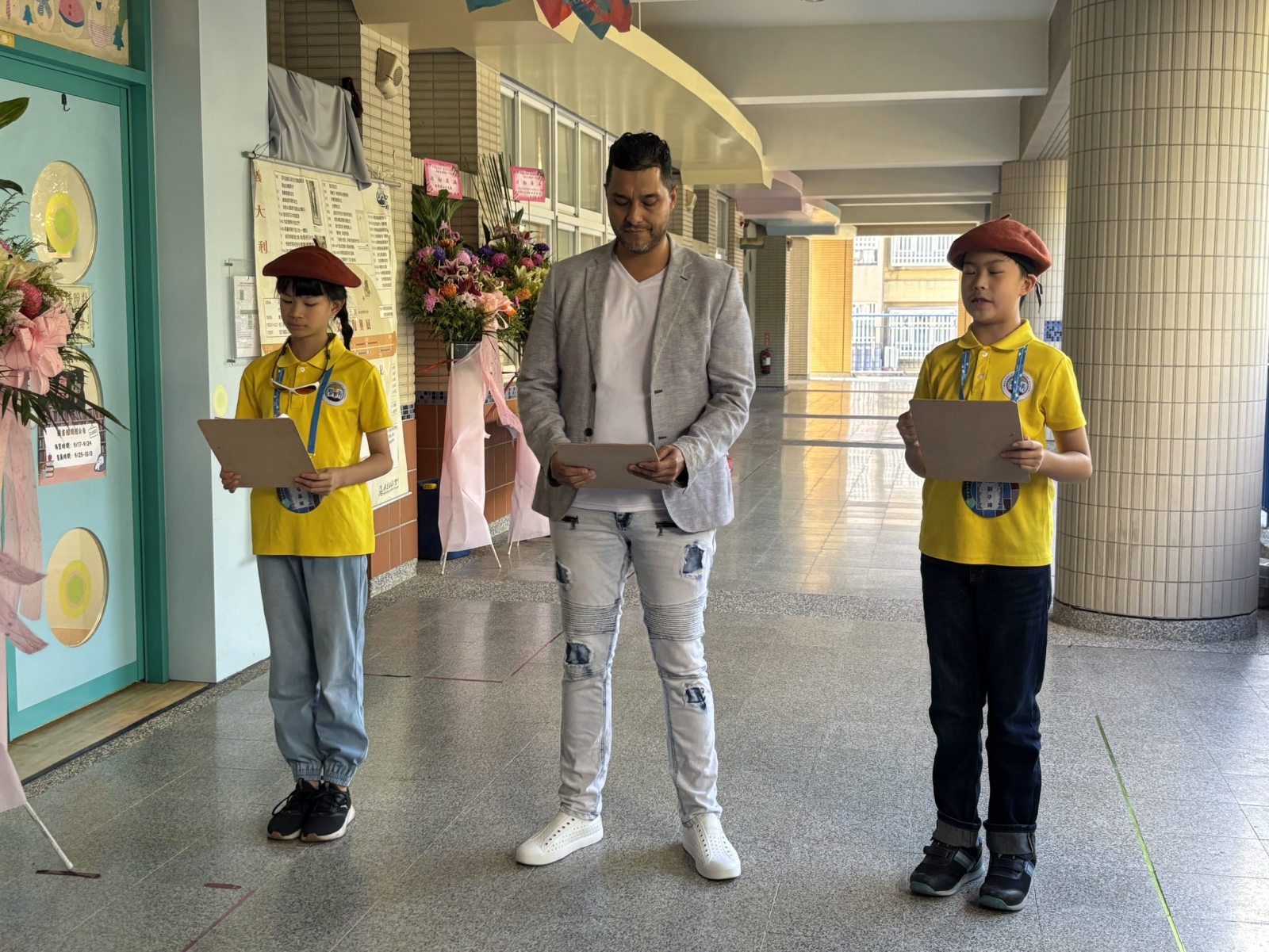 ▲接著小尖兵們移駕到展覽場地,在展場外由外師帶領兩位小尖兵用英文引言開場,再讓來賓步入展場,儀式感十足。