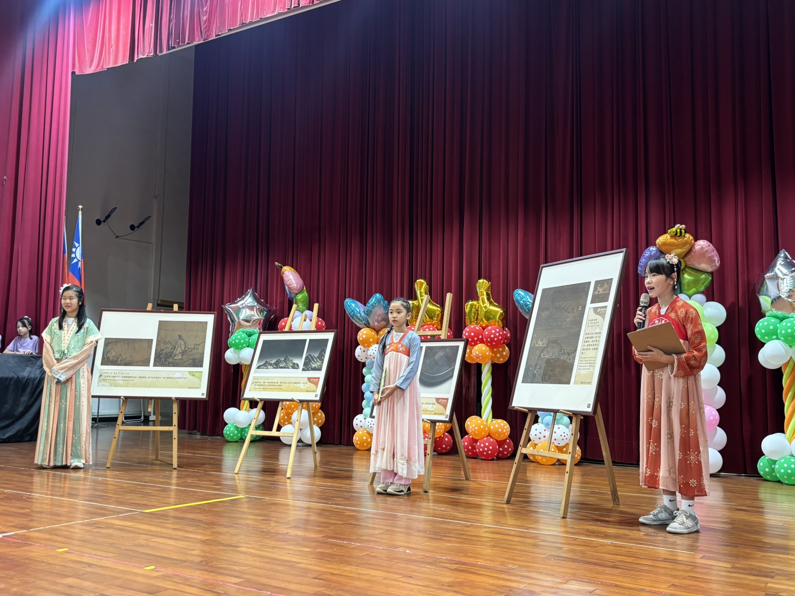 ▲中正國小三位小小導覽員穿上宋代古裝進行畫作導覽,還以金門話介紹文房四寶,讓學習增添在地特色!
