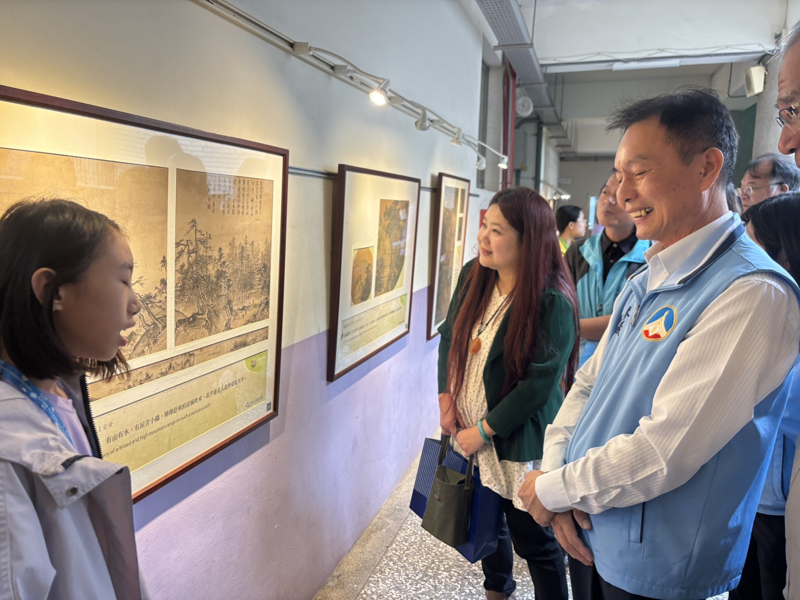 ▲來賓們認真聆聽小尖兵導覽,指導老師分享,這些導覽稿都是由學生親自查找資料、撰寫內容,再加入自己的觀點,因此在導覽時也更貼近孩子的真實想法。