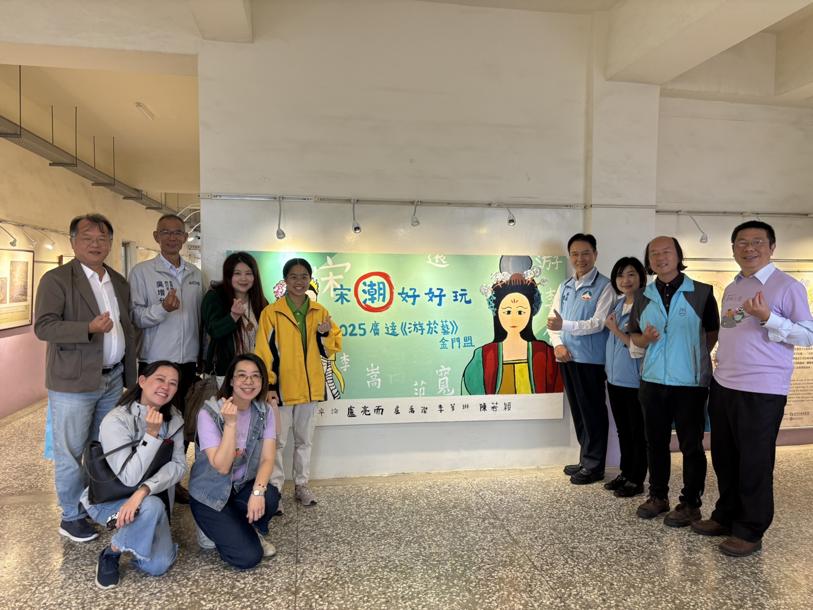▲展覽的作品佈置於走廊兩側,並特別加裝畫作照燈和吊軌,讓作品更有質感。圖上則是中正國小美術班學生一起完成的「宋潮好好玩」大型主題板,成為展區中的亮點。