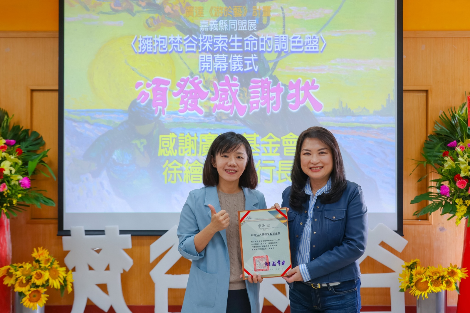 ▲由嘉義縣政府教育處顏廷育副處長代表嘉義縣政府致贈感謝狀,感謝廣達文教基金會提供豐富的藝術作品進行推廣藝術教育,讓藝術走進校園、讓孩子貼近藝術。
