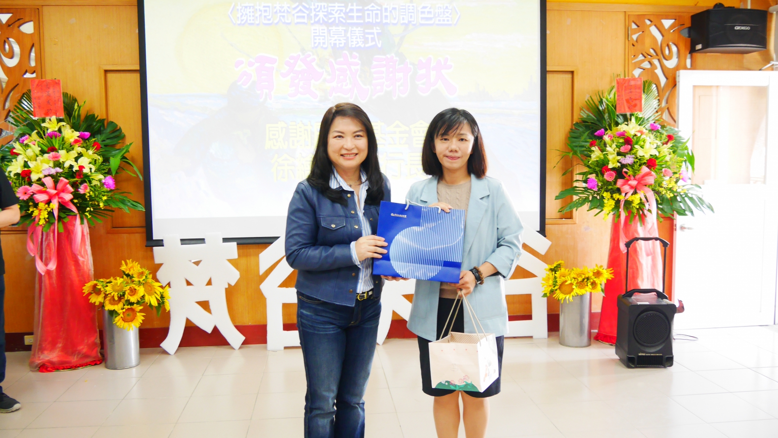▲廣達文教基金會徐繪珈執行長代表基金會回贈禮品,感謝嘉義縣政府多年支持廣達《游於藝》計畫並肩同行,攜手讓更多孩子看見藝術的力量。