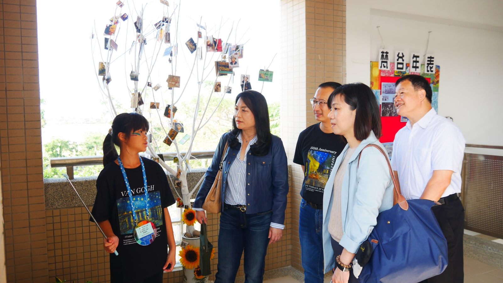 典禮結束後,來賓們隨即在景山國小小尖兵的引導下,進行「擁抱梵谷,探索生命的調色盤」巡迴展導覽。小尖兵們自信且流暢的解說,不僅展現了高度的專業訓練,更不怯場地與現場來賓進行互動。在講解梵谷《麥田群鴨》畫作時,小尖兵分享:「畫作內的天空雖然暗沉沉,但透出一些光明,就像人生可能會遇到低谷,但也會有希望。」這份結合畫作與人生哲思的動人詮釋,令在場來賓動容與驚豔。