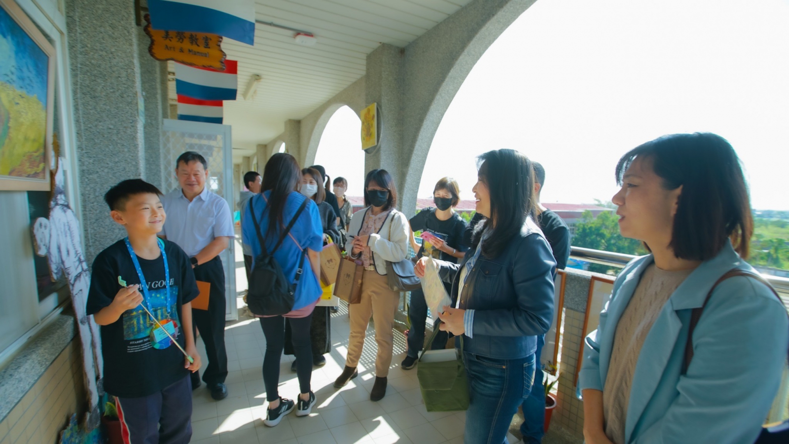 典禮中,徐繪珈執行長、顏廷育副處長、蔡信典議員、翁聰賢議員及盟主黃凱杰校長依序致詞,表達對藝術教育的重視與期許。接著,嘉義縣政府頒贈感謝狀予基金會,感謝基金會長期提供優質藝術作品於校園巡迴;而基金會亦回贈禮品,感謝嘉義縣政府始終如一的支持。隨後,基金會頒發感謝狀給予114學年度各參展學校,感謝他們的熱忱參與。最令人期待的環節,是景山國小小尖兵代表從基金會手中接獲導覽名牌,象徵著114學年度嘉義縣同盟的小尖兵正式接下藝術傳遞的重任,他們將成為展覽與觀眾間的專業橋樑。