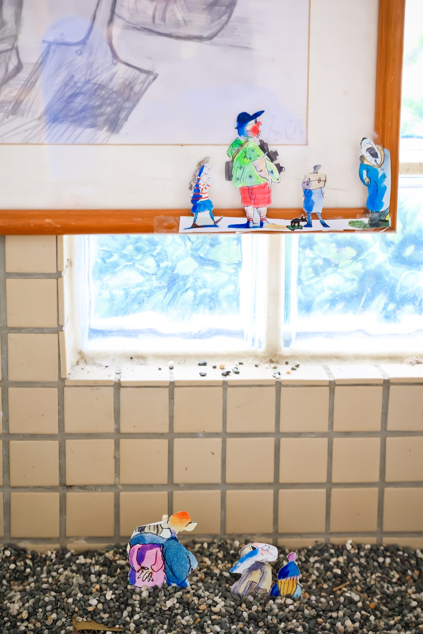▲ 手繪的小小人物畫,散落在窗台的石子堆及畫作各個角落,像是一群正在觀展的迷你角色,細膩又充滿故事感,為展場增添了驚喜與趣味。