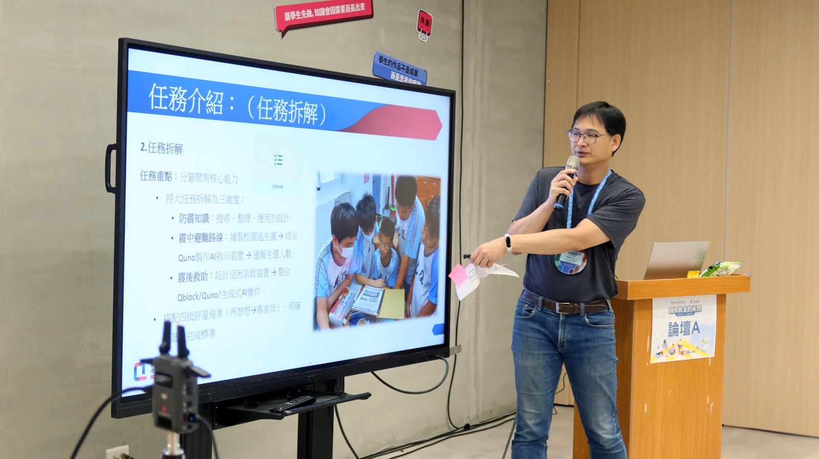 論壇A「穩韌」,由國立臺北教育大學呂金燮教授、國立臺灣海洋大學張芝萱教授擔任主持人,邀請八校:臺南市二溪國小、臺南市篤加國小、彰化縣土庫國小、臺北市光復國小、嘉義市港坪國小、新竹市東門國小、新北市思賢國小、高雄市五福國中進行發表,分享各校如何結合數位工具解決困境,展現即抵抗風險、具彈性不易崩解的防護之力。圖為臺北市光復國小陳建奇老師分享發表。