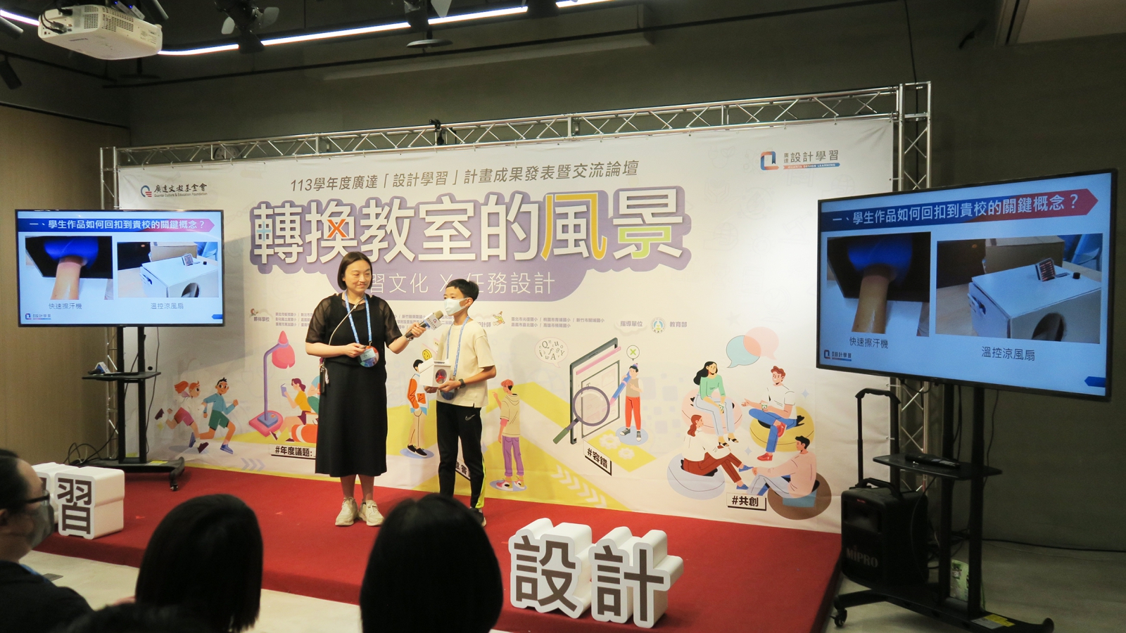 論壇B「調韌」,由國立嘉義大學附設實驗小學沈桂枝校長、國立嘉義大學黃楷茹教授擔任主持人,邀請七校:嘉義縣美林國小、臺南市南新國中、臺南市鹽行國中、新北市板橋國小、臺北市立大學附設實驗小學、桃園市青埔國小、新竹市關埔國小進行發表,分享各校如何在面對社區沒落、校園困境,尋找因應挑戰、維持平衡與共生的循環力量。圖為新竹市關埔國小賴昀瑩老師與小設計師分享任務實踐的歷程。