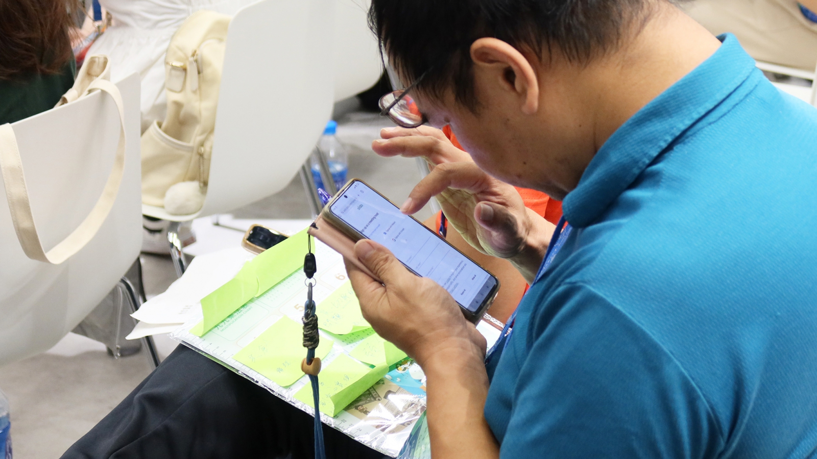 最終場參與式論壇「語言轉變 ‧ 學習轉動:與您共創學習文化的力量」,由國立臺灣師範大學陳偉仁教授擔任講師,並邀請現場學員將自己在論壇所記錄到關於設計學習計畫在任務設計使用的語言、說學生作品使用的語言、教師獨到心法使用的語言…等關鍵字詞,鍵入Slido,共同匯聚所有參與者的字詞產出文字雲,反映設計學習計畫的學習文化。圖為學員正將自己所寫的關鍵字詞鍵入Slido,並思考這些語詞與自己使用的教學語言有何異同。