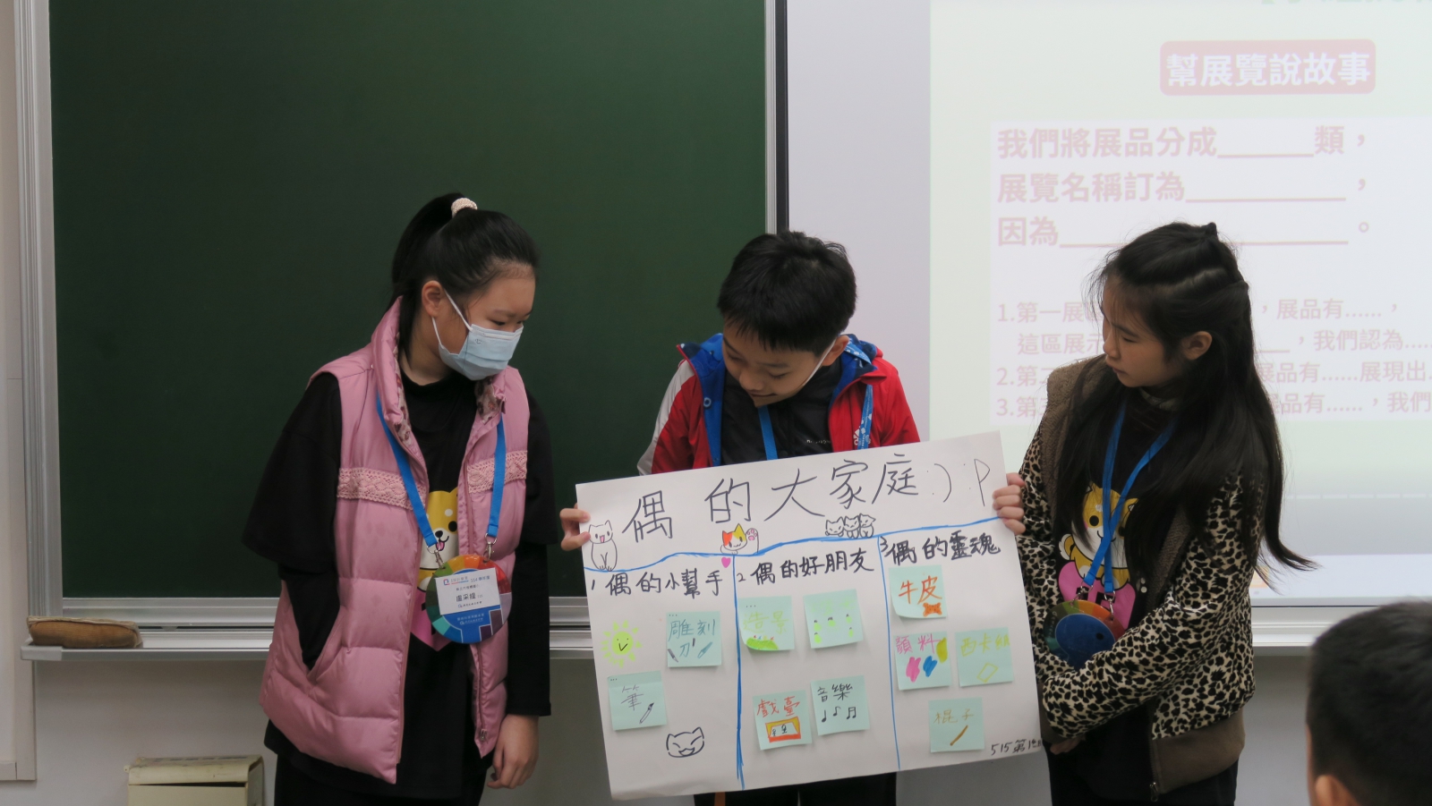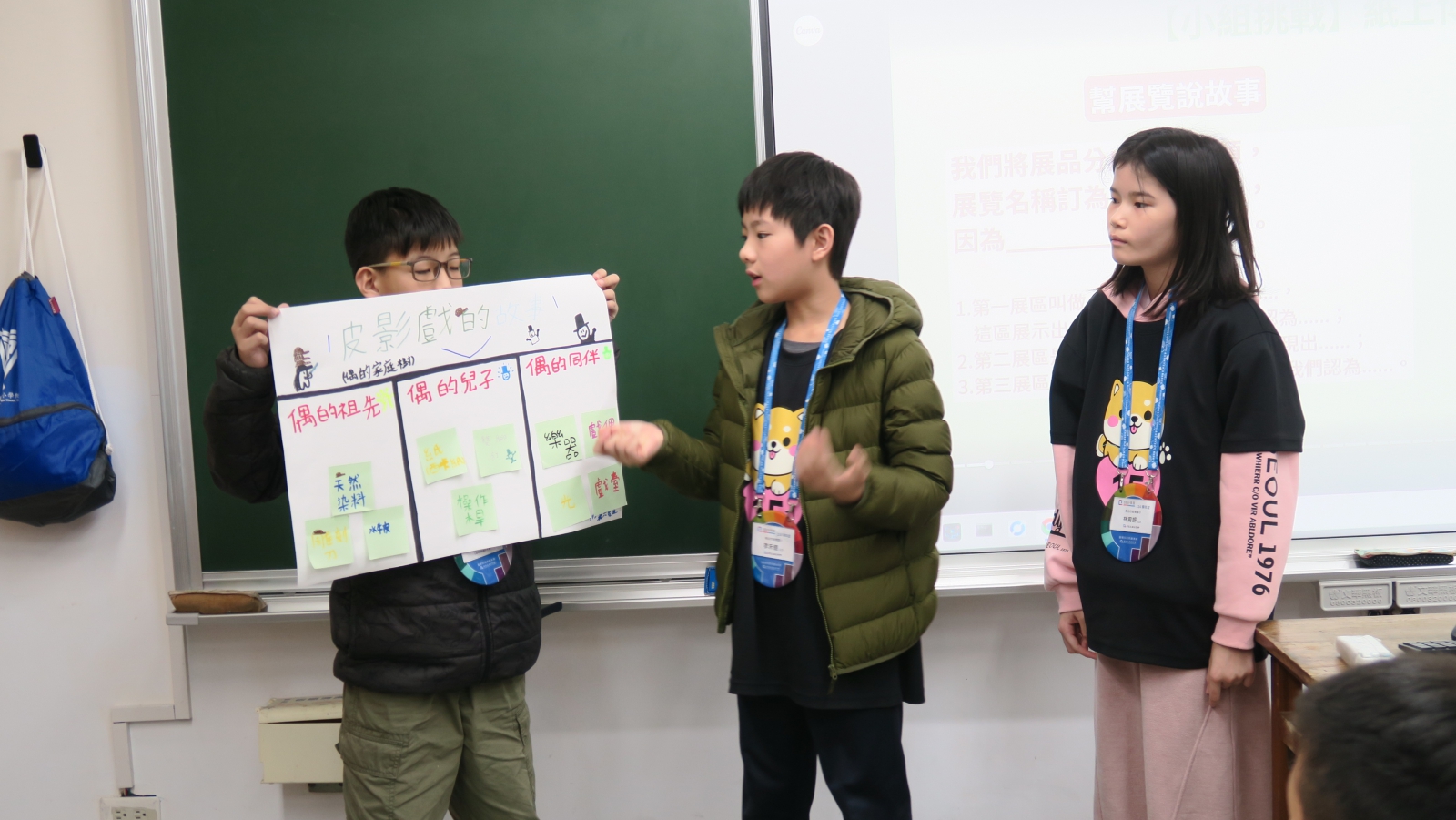 「偶的大家庭」展覽中,學生先將製作皮影戲偶的材料與上演皮影戲的道具進行分類,逐步發展各展區的小標題,再由此延伸出整體展覽名稱,完整呈現策展思考的歷程。