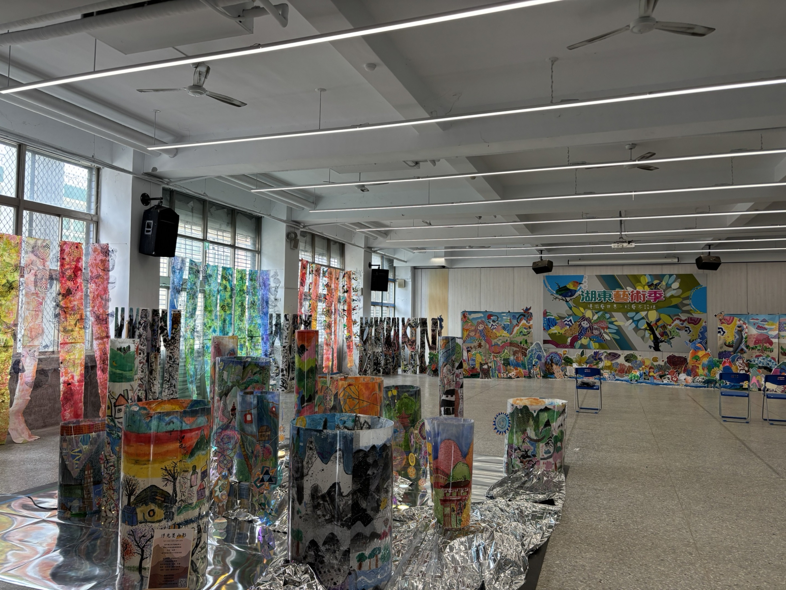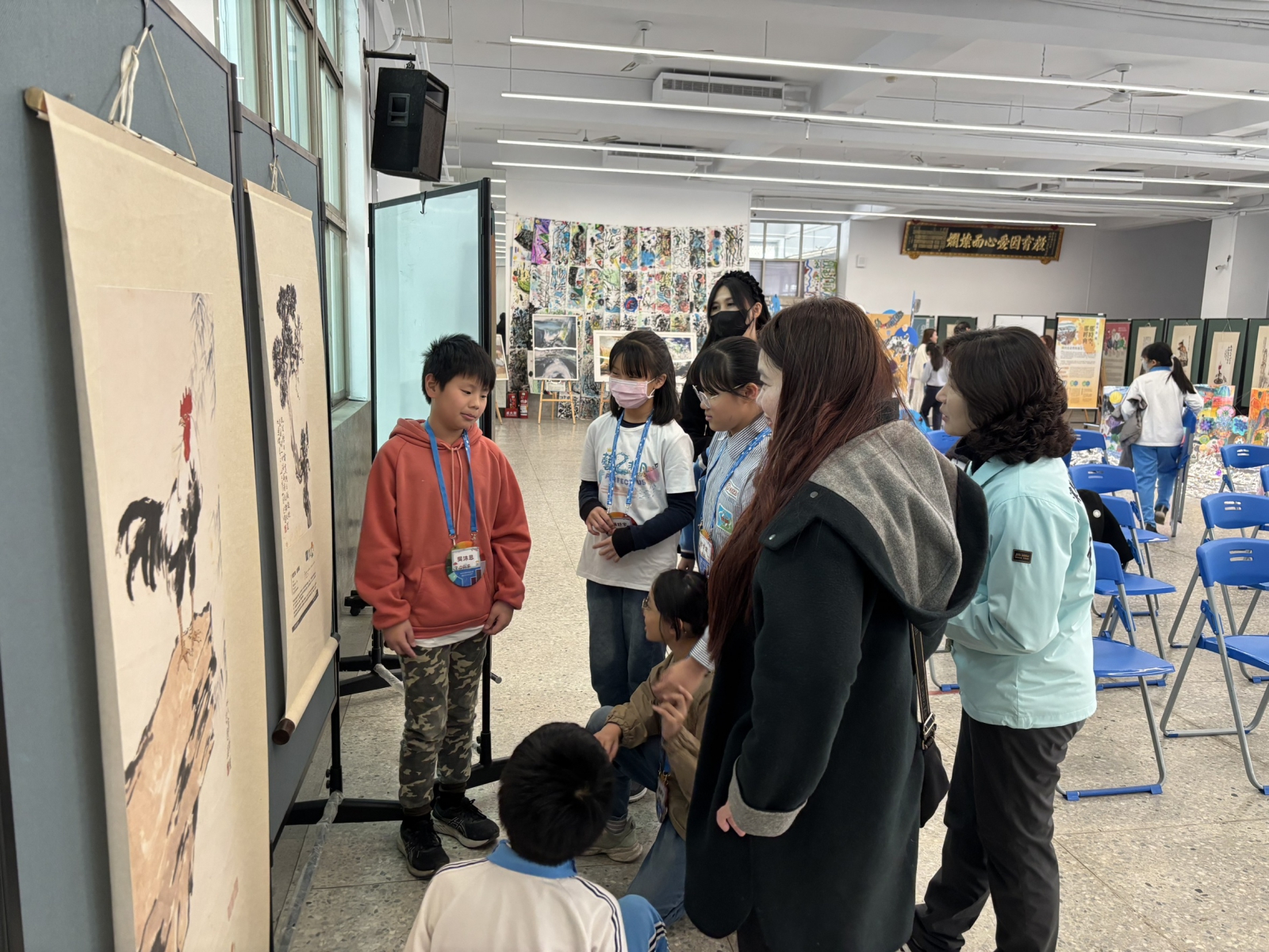 ▲湖東國小各年級學生將學習成果融入展場,讓展覽空間充滿孩子們的創作能量;參與活動的來賓除欣賞畫作外,也能欣賞學生作品。