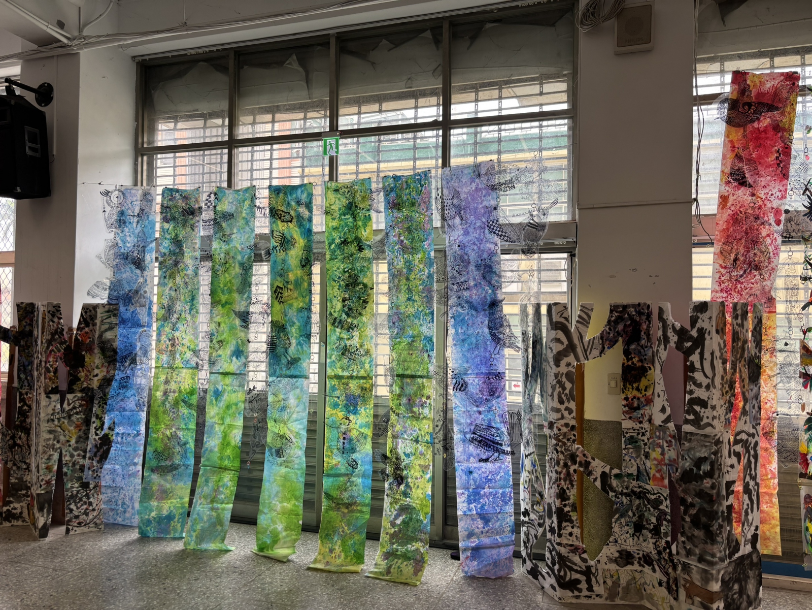 ▲四年級同學創作的「彩墨森林」,孩子們體驗彩墨的濃淡乾溼,並運用了宣紙透光的特性。讓畫作在自然光的映照下,色彩變得清澈,彷彿整座森林都被點亮了!