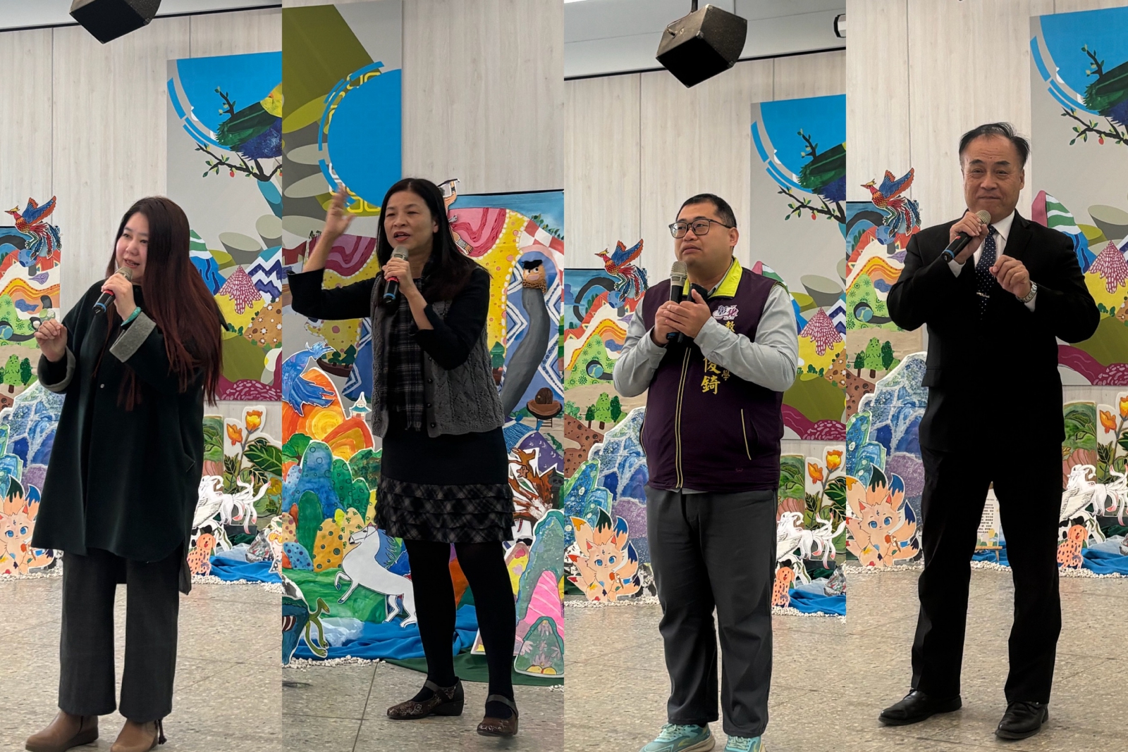 ▲開幕當天,基金會吳宛娟協理到場支持湖東國小,勉勵大家持續用藝術點亮校園;轉調至平和國小的王麗惠校長回到熟悉的校園,用親切又幽默的導覽分享對湖東的肯定;接下來徐文男校長接棒帶領,相信孩子們在他的引導下,能建立自信、開創自己的天地;教育處黃俊錡督學也親臨現場,長期關心學校活動與學生,實際參與給予滿滿支持。