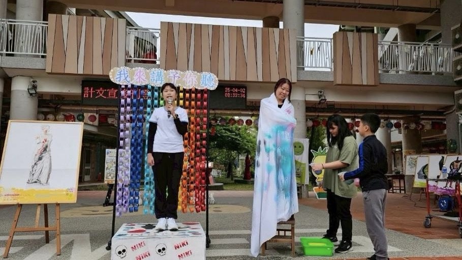 台南市關廟國小:在開幕式上搭配《米羅的維納斯》演出這件射擊繪畫的創作過程,不只聽故事還能實際操作,台下的學生們都熱烈參與。
