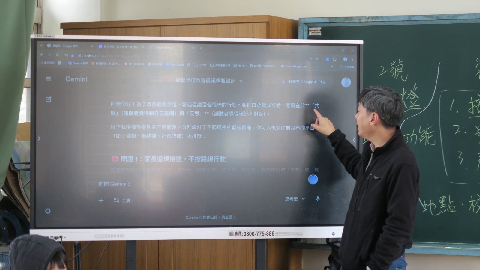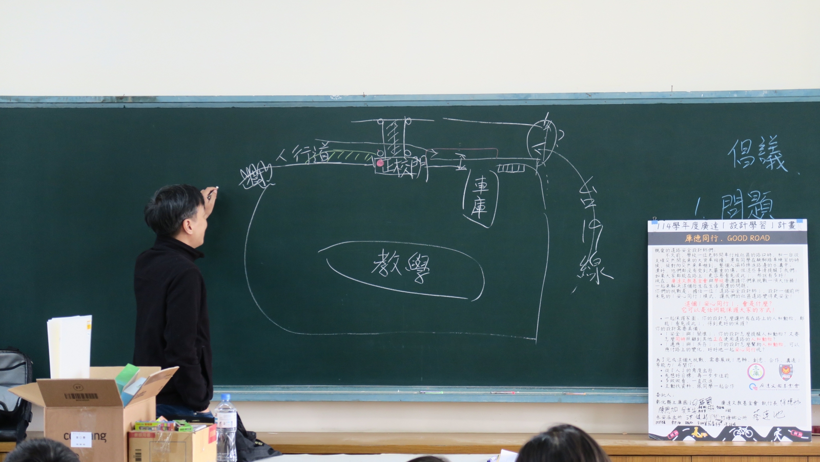 將所觀察走踏的道路現況及情境直接繪製在黑板上,帶領著孩子一個一個剖析現況、拆解問題。