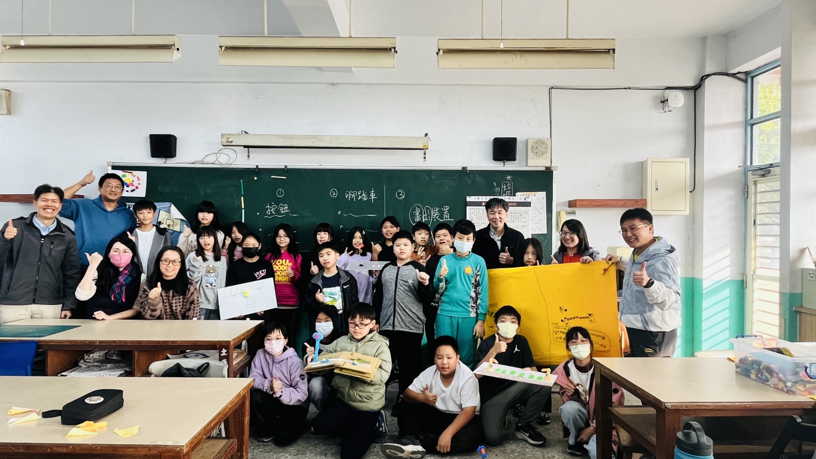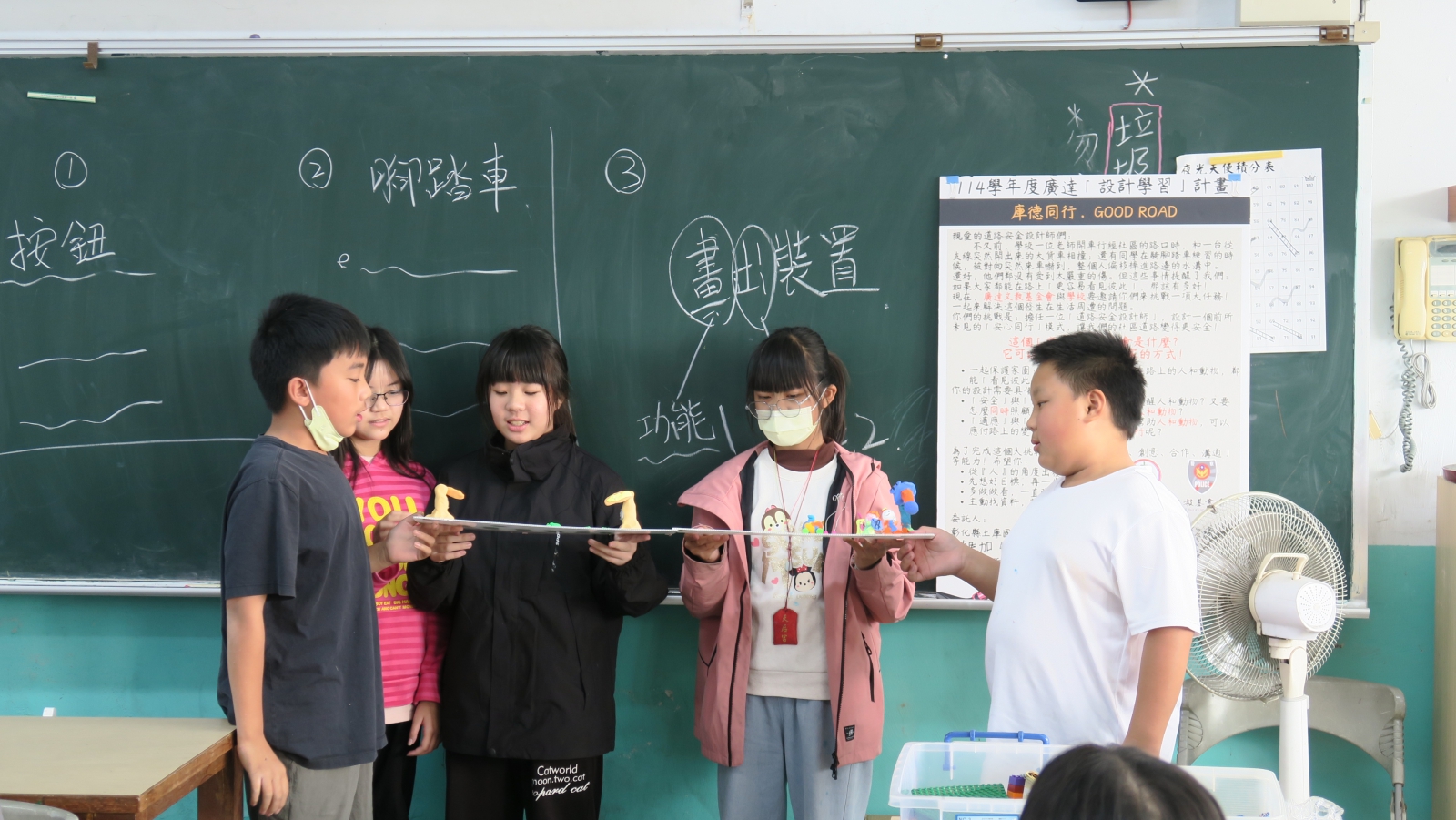 不僅要打造出原型,原型作品的發表更是關鍵的一步。孩子透過說明與分享,將設計想法與實際操作連結起來,讓創意被理解、被回應,並從其他小組的回饋中持續修正與迭代作品。這組設計師聚焦校門口行人直行穿越的安全需求,考量轉角死角可能造成來車忽視,於人行道前後設置按鈕,啟動警示燈與聲響,提醒左右來車注意行人,提升通學路線的安全性。