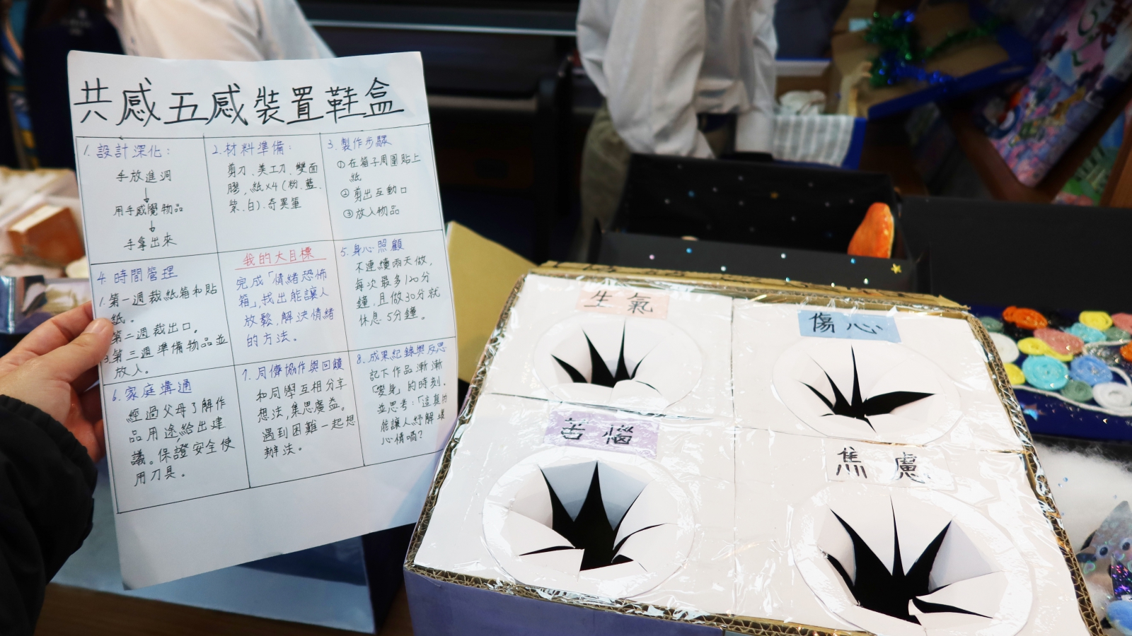 療韌設計師針對課業壓力很大但卻不知道如何緩解的學生所設計。當你感覺生氣時,就把時放入「生氣」恐怖箱中,箱中的小物能幫你舒緩情緒喔!那如果感覺「焦慮」時,不知道手在恐怖箱中會感受到甚麼呢?