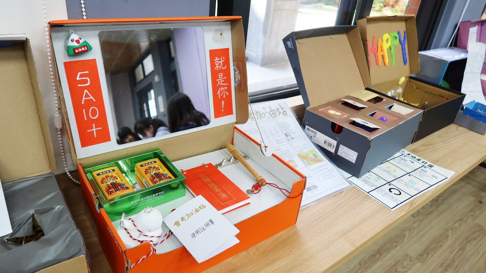 療韌設計師對焦慮的國小生所設計的五感療韌裝置,𧃫此來提升他們的信心與戰鬥力!聲:按下按鈕播放加油聲。觸:於金榜題名簿簽字留名,榜上有你名。味:吃下狀元糖,考運皆亨通。嗅:左前小白鯨帶著葡萄柚精油,讓人提振心情與專注力。視:從鏡子裡看見自己的眼神,訴說著永不言敗的決心。