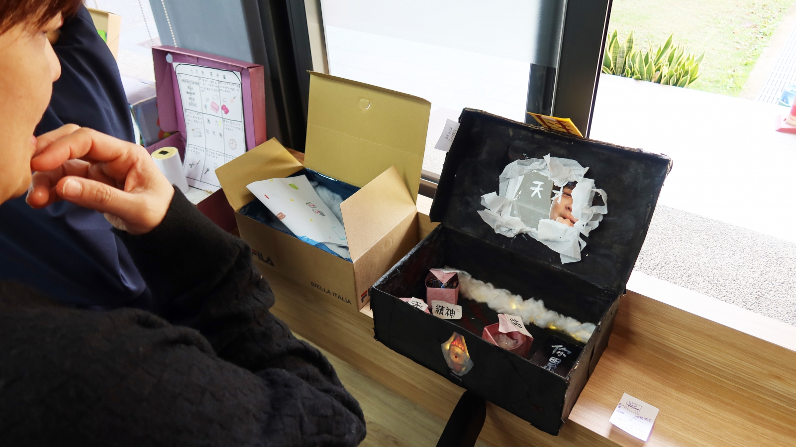 作品名稱:《被封印的天才》 療韌設計師因看到很多同學因為寫作文寫不出來,而感到苦惱…所以設計了這個「激發創作靈感」的裝置。黑色詭異的外箱,上面貼著黃色封印符,打開後血手印於箱底,但當你望向那面鏡子時,鏡子上的「天才」字樣,則映射在觀者額頭,引起觀者的凝視,啟動思考,而箱中擺入可捏、吃、聞的小物件刺激靈感,這看似詭異但又充滿溫暖的小細節,令人印象深刻。
