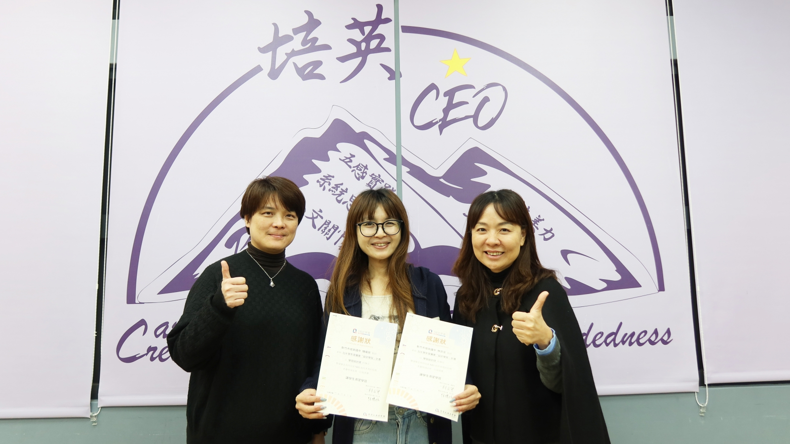 由廣達文教基金會科創處廖靜如協理(左)頒贈感謝狀予以個人身分參與計畫的學習設計師:林羿汝教師。圖為廖靜如協理、林羿汝老師、新竹市培英國中潘致惠校長(右)共同合影。