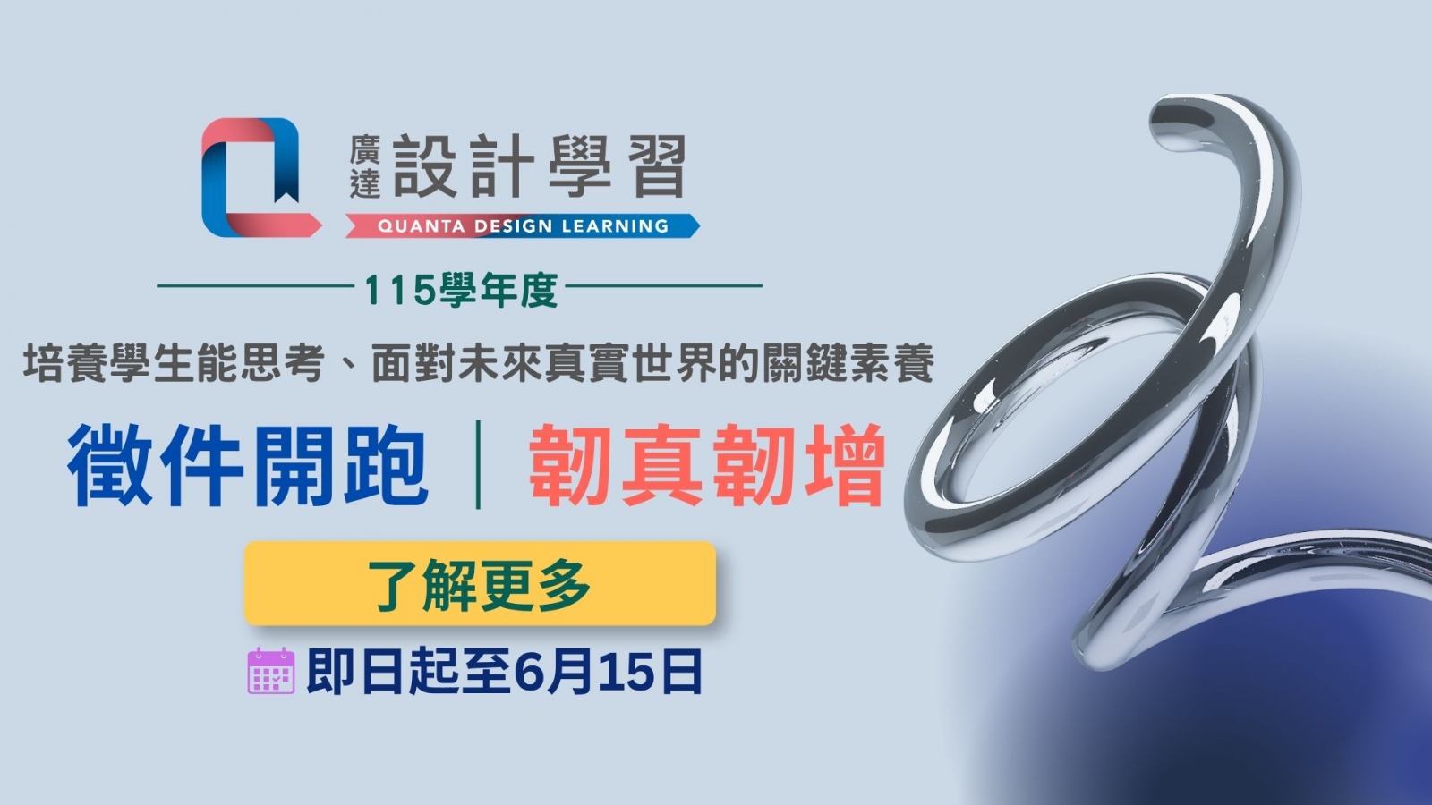 廣達「設計學習」計畫自102學年度起啟動,已深耕教學現場超過13年,我們以任務導向學習(PBL) 結合設計思考(Design Thinking)為核心,讓學習不再只是課堂上的知識理解,而是一次次面對挑戰、解決問題的真實歷程。